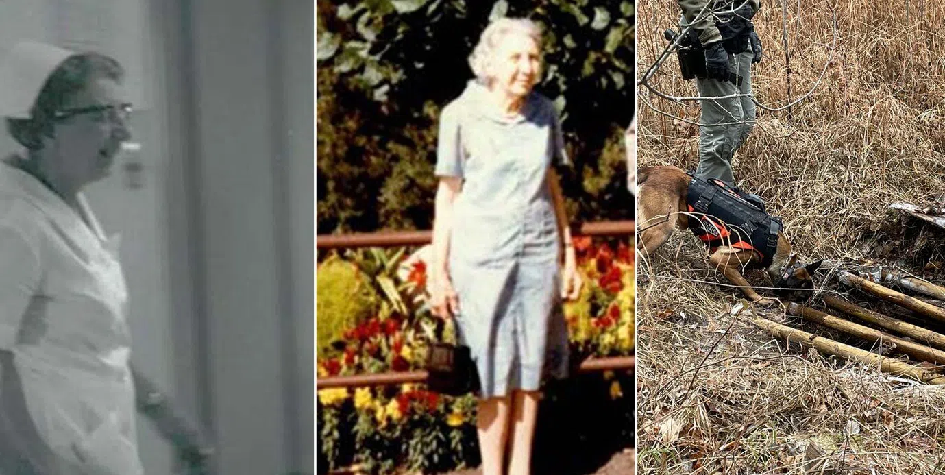 This composite of handout images shows Ruth Clarke, left and centre, an 83-year-old female who was suspected to have been murdered in 1990, and police searching for her remains, right. THE CANADIAN PRESS/Handout - Edmonton Police Service