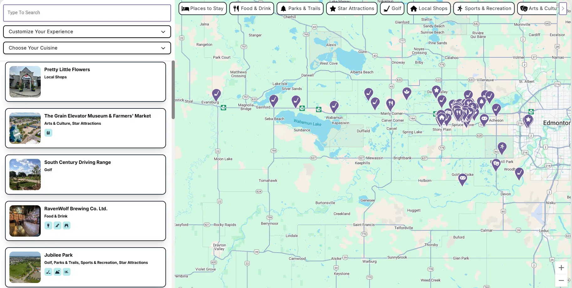 - An interactive map with broad categories that list things to do, places to eat, where to stay, star attractions, and more in Spruce Grove and the region.