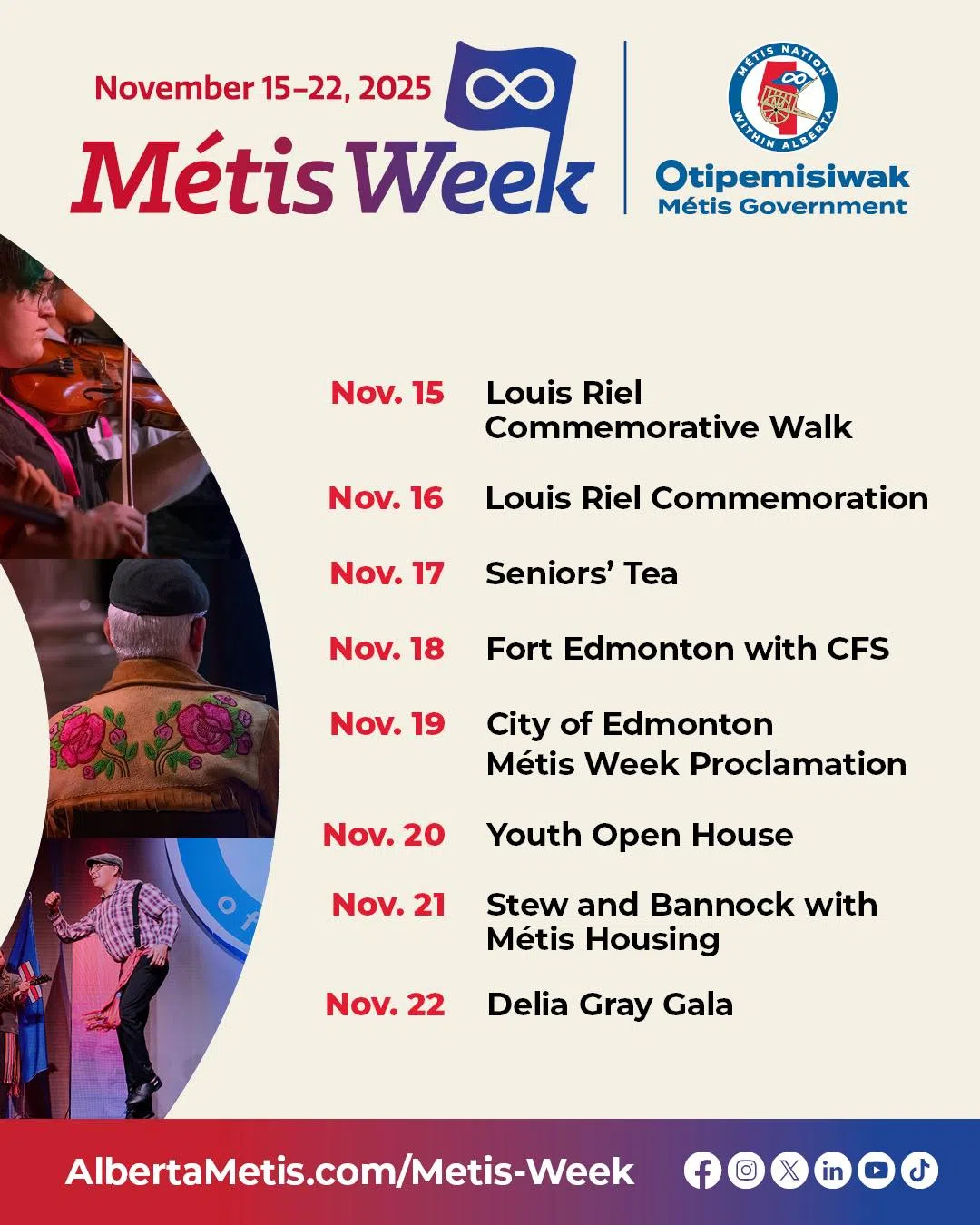 From November 15 to 22, join the Otipemisiwak Métis Government in commemorating Métis Week at each of the featured events!
